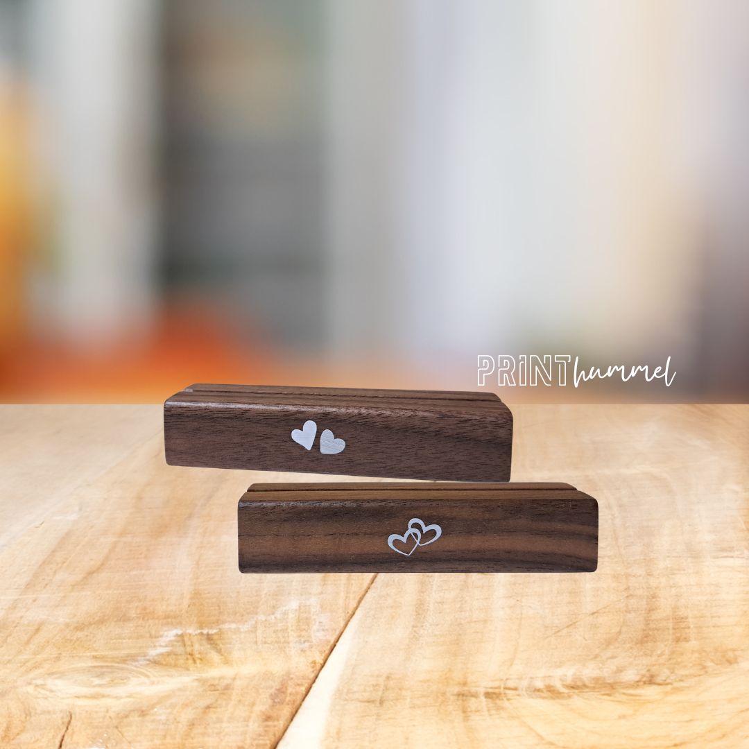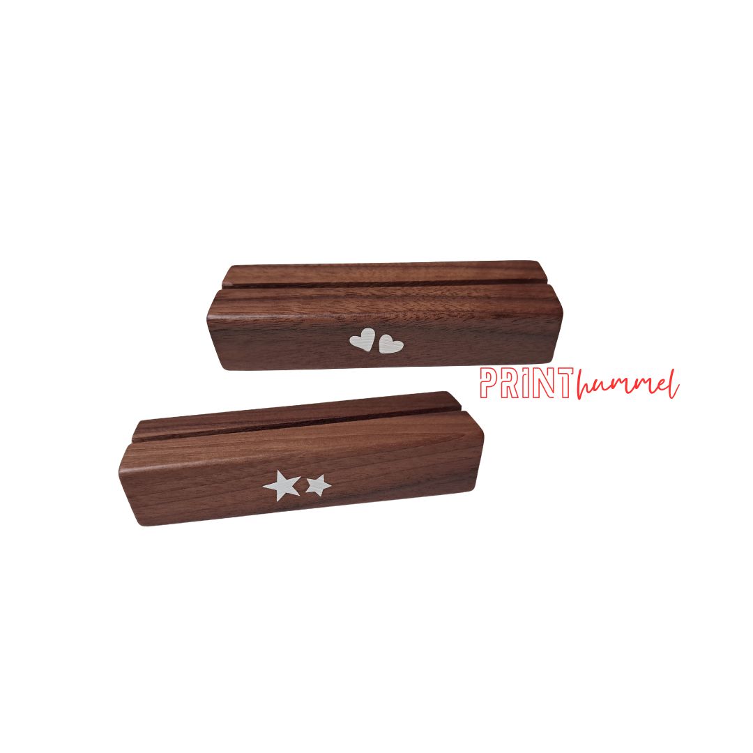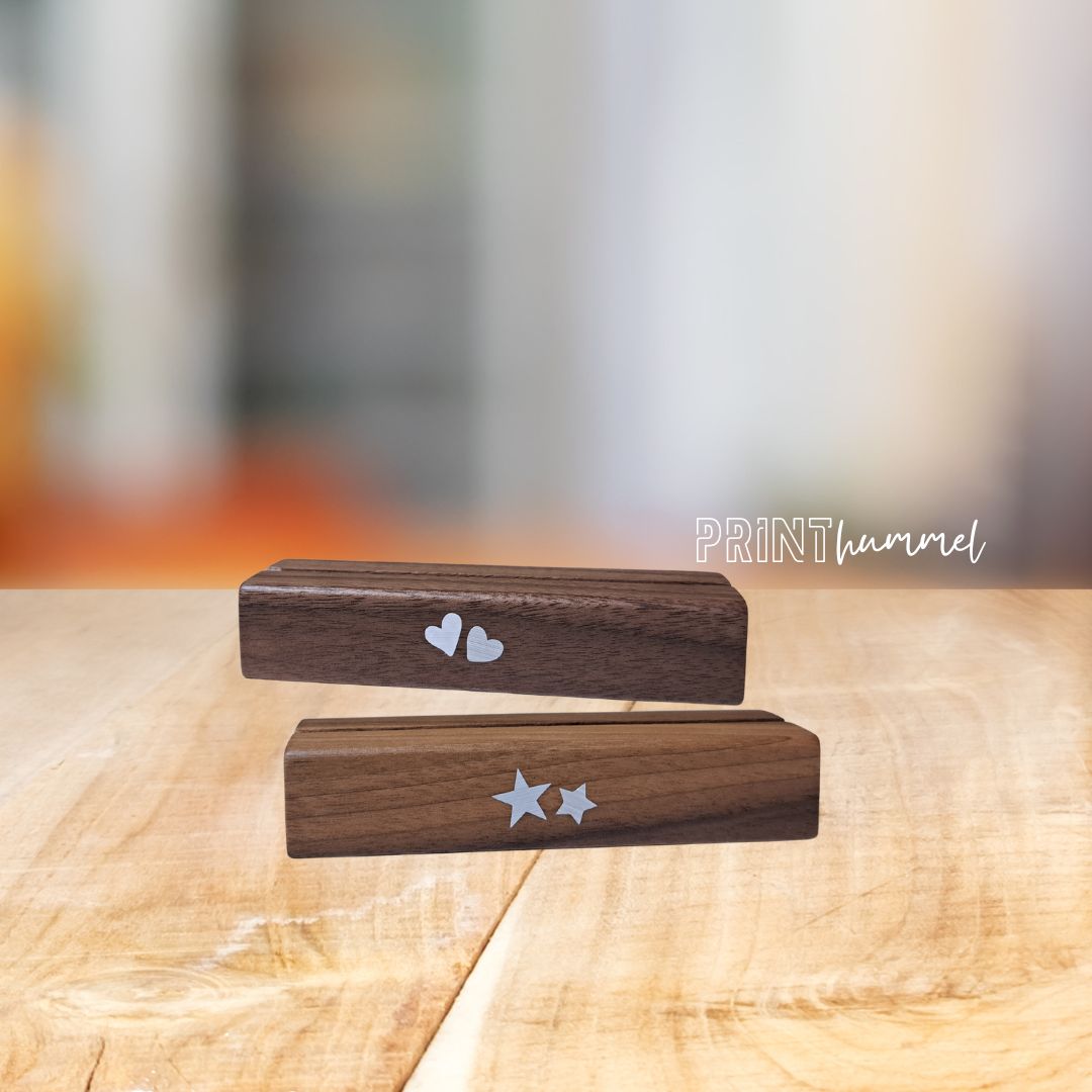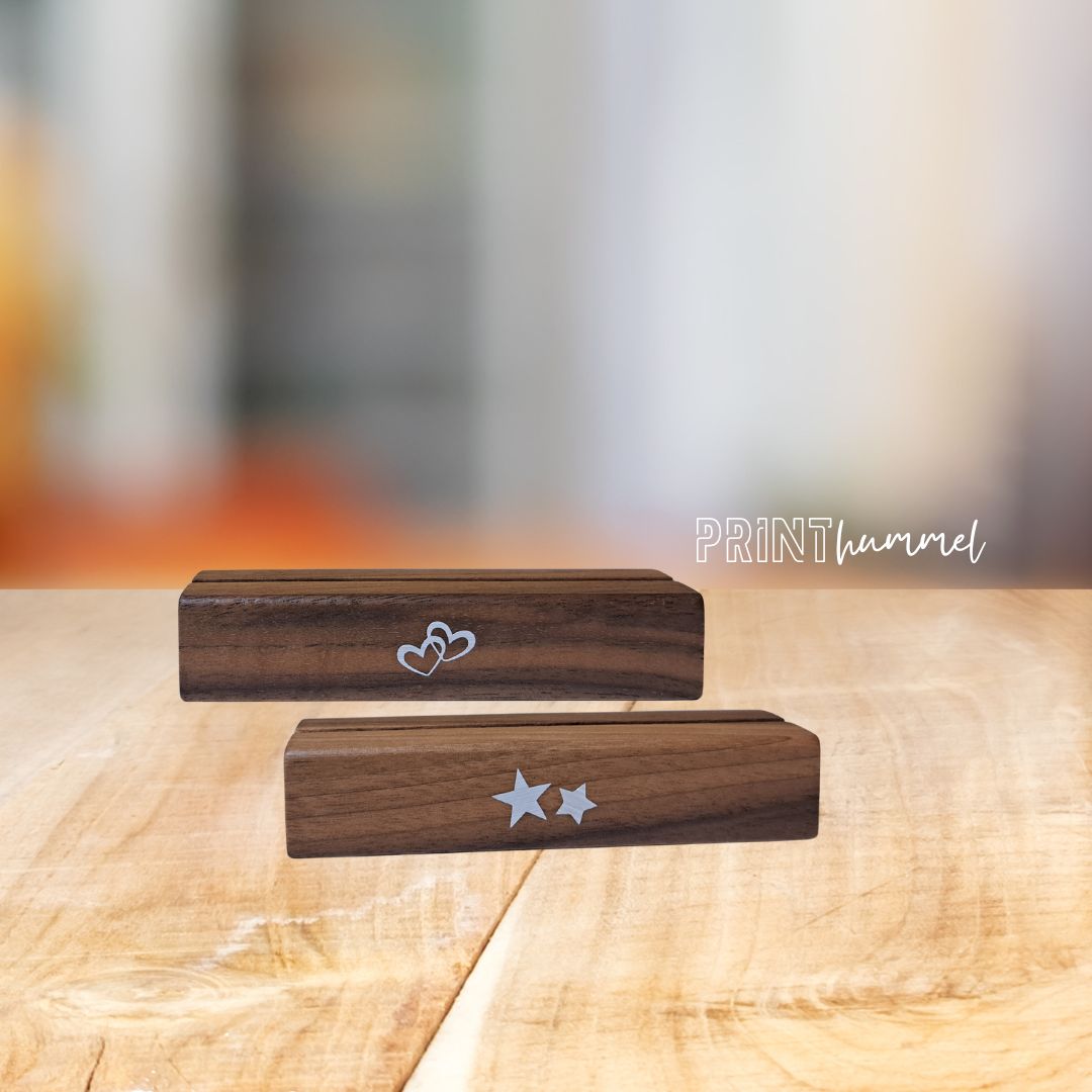 Dieses edle Holz-Kartenhalter Set (2 Stück) aus massivem Nussholz ist die perfekte Kombination aus Natürlichkeit und Stil. Die feine silberne Gravur – wahlweise Herz oder Stern – verleiht jedem Stück eine elegante, hochwertige Note. Ideal für Fotos, Postkarten, Platzkarten oder Menütafeln bei Hochzeiten, Feiern und im Alltag.