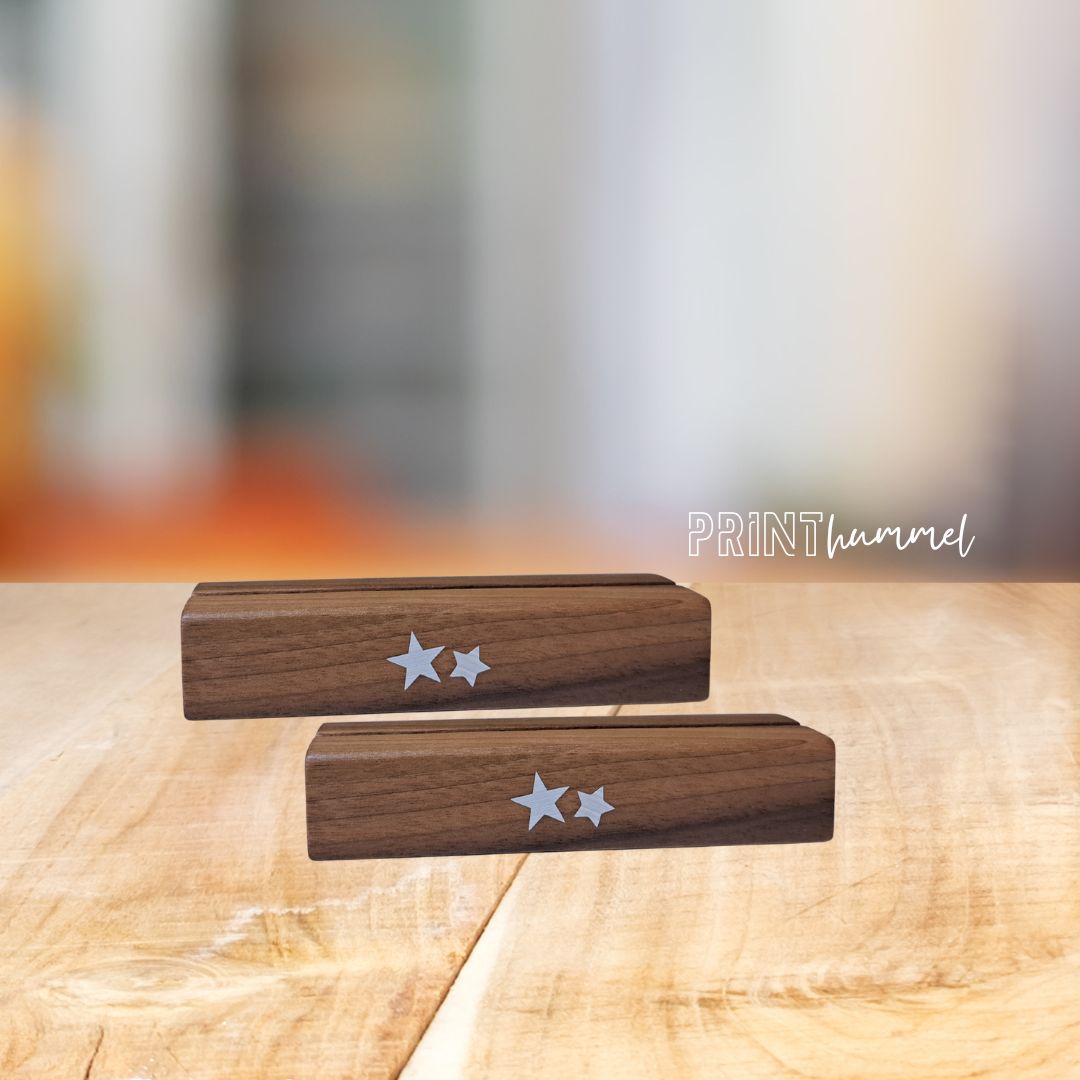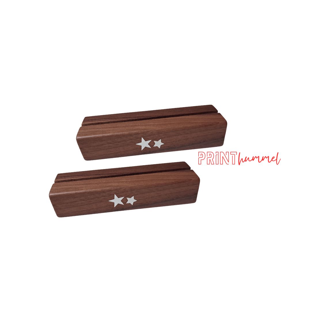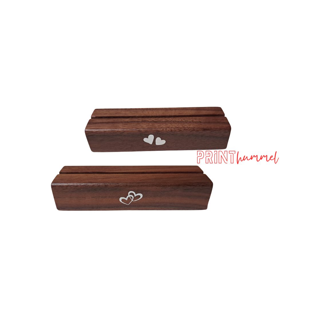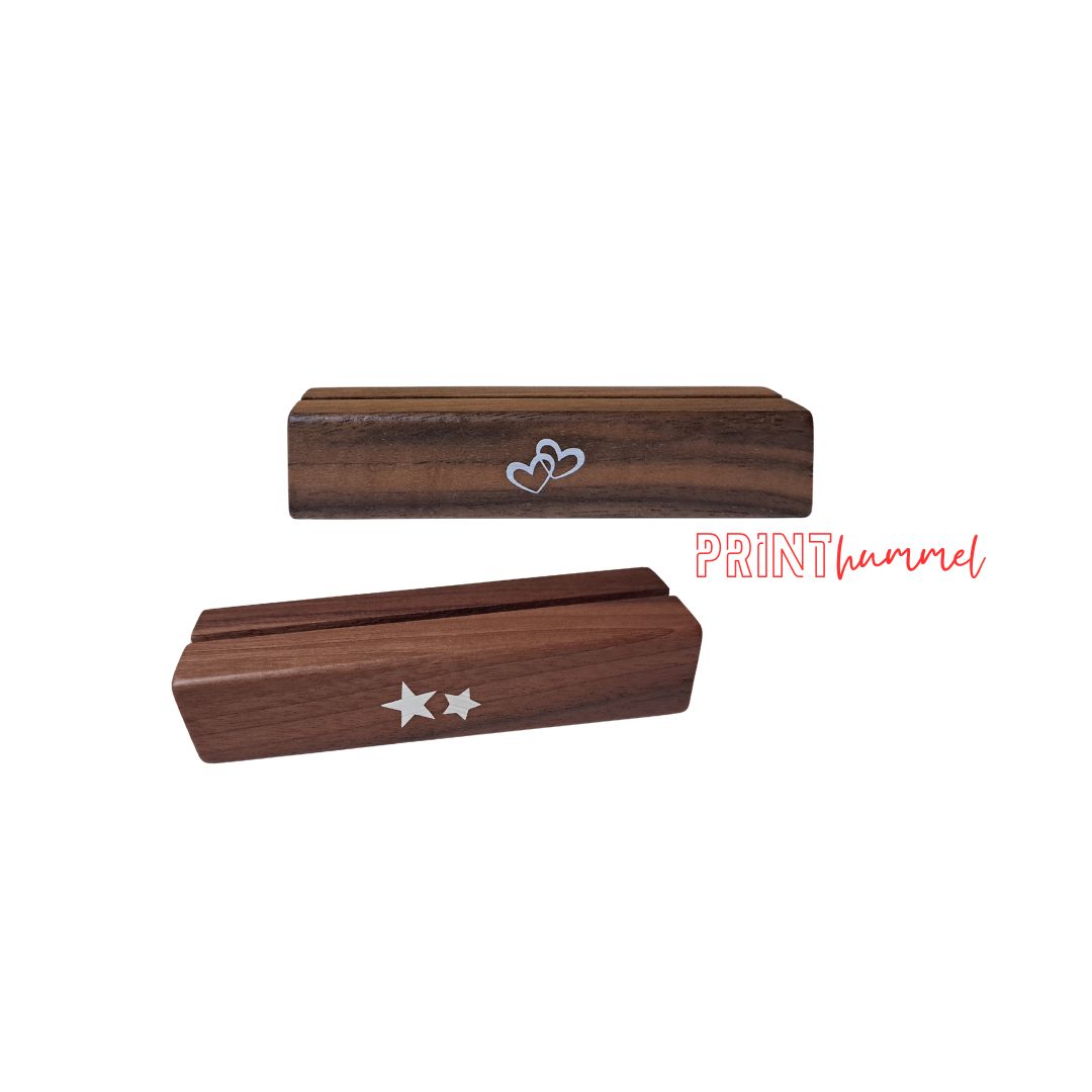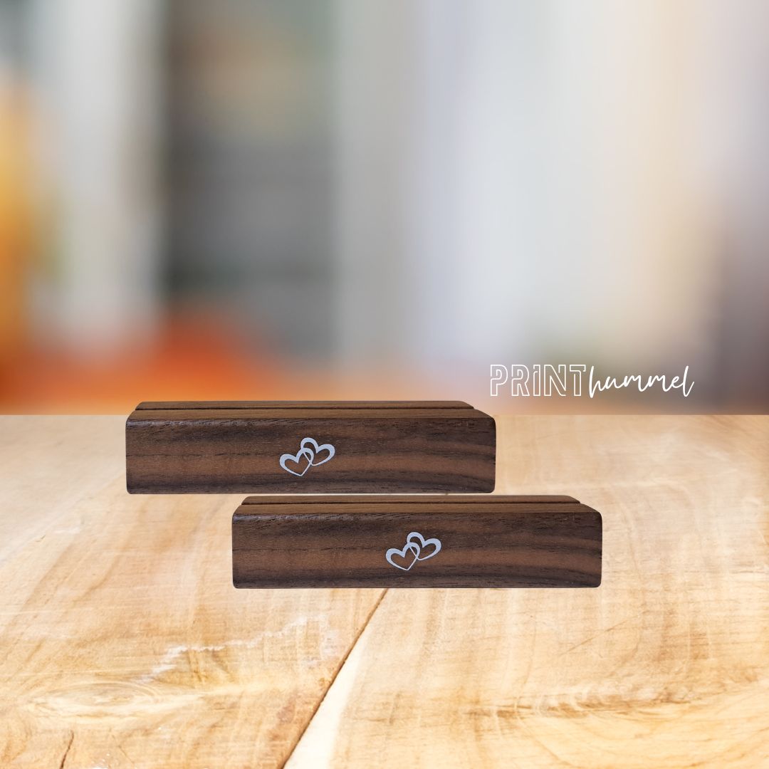 Dieses edle Holz-Kartenhalter Set (2 Stück) aus massivem Nussholz ist die perfekte Kombination aus Natürlichkeit und Stil. Die feine silberne Gravur – wahlweise Herz oder Stern – verleiht jedem Stück eine elegante, hochwertige Note. Ideal für Fotos, Postkarten, Platzkarten oder Menütafeln bei Hochzeiten, Feiern und im Alltag.