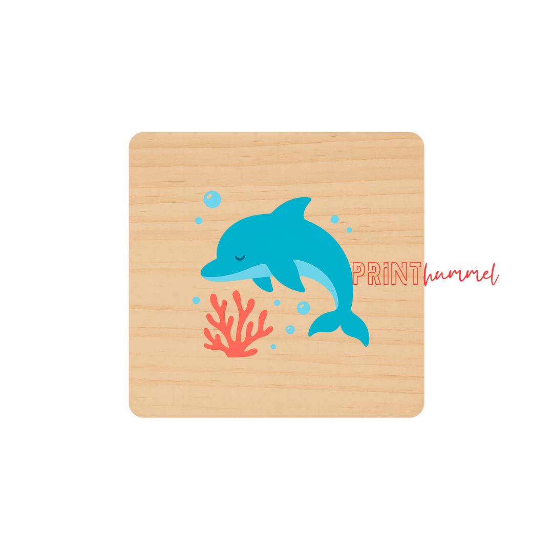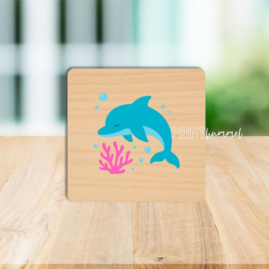 Dieser liebevoll gestaltete Holz-Untersetzer mit Delfin-Motiv bringt maritimes Flair auf jeden Tisch. Der fröhliche blaue Delfin, umgeben von kleinen Luftblasen und farbigen Korallen, macht den Untersetzer zu einem echten Hingucker – perfekt für Kinder, Meeresliebhaber und alle, die es farbenfroh mögen. Der hochwertige Direktdruck auf hellem Holz sorgt für klare, leuchtende Farben und eine langlebige Oberfläche. Ideal, um Tische vor Feuchtigkeit, Kratzern und Abdrücken zu schützen.