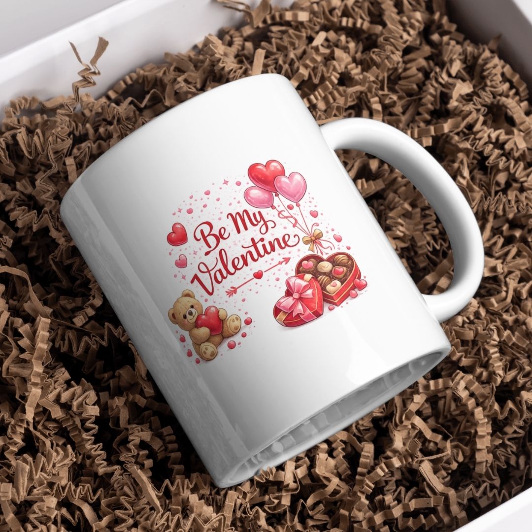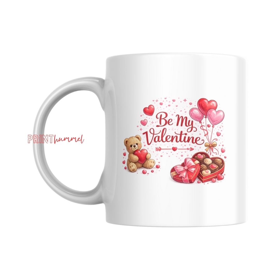 Diese liebevoll gestaltete Be My Valentine Tasse ist das perfekte Geschenk für alle die Liebe auf besondere Weise zeigen möchten. Das romantische Design mit Herzen einem süßen Teddy Luftballons und einer Pralinenbox vermittelt Wärme Zuneigung und echte Herzensmomente. Ob beim Frühstück am Valentinstag oder bei einer gemütlichen Kaffeepause diese Tasse sorgt garantiert für ein Lächeln.