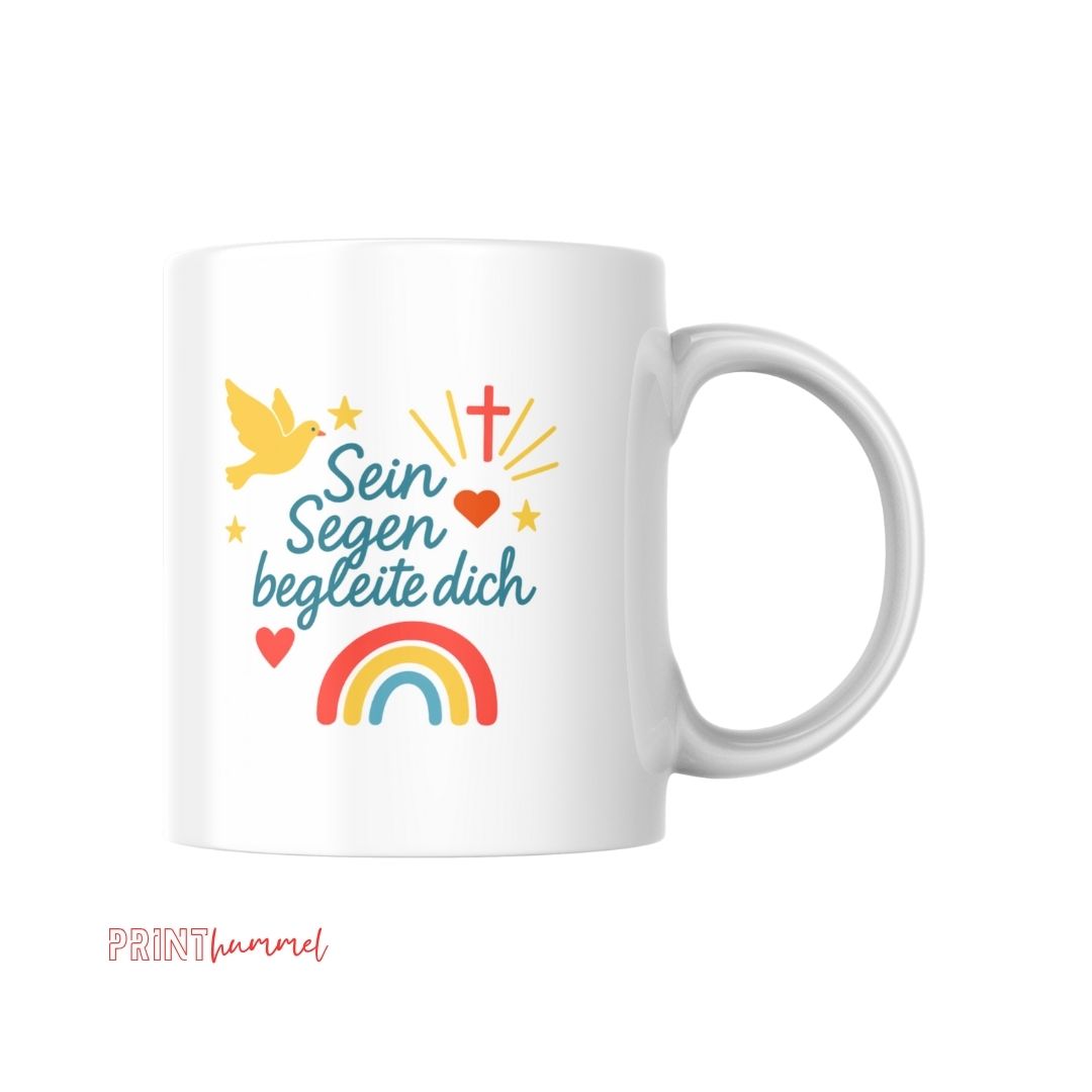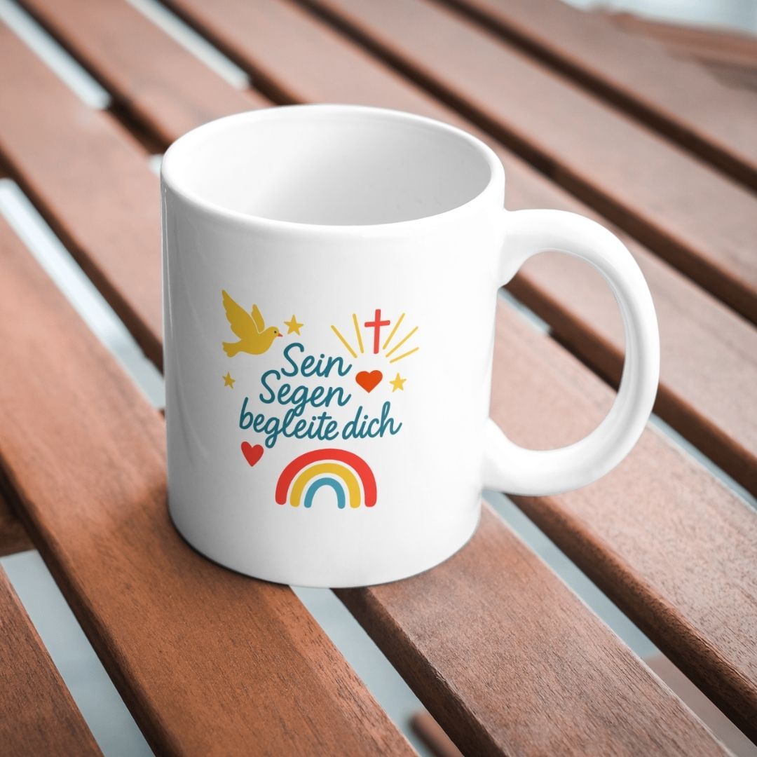 Diese liebevoll gestaltete Tasse mit der Aufschrift „Sein Segen begleite dich“ ist das perfekte Geschenk für besondere Anlässe wie Taufe, Kommunion, Konfirmation oder einfach als ermutigendes Zeichen. Das farbenfrohe Design mit Regenbogen, Kreuz, Taube und Herzen vermittelt Hoffnung, Liebe und Geborgenheit. Hochwertig bedruckt, langlebig und spülmaschinengeeignet – ein wunderschöner Begleiter für jeden Tag.